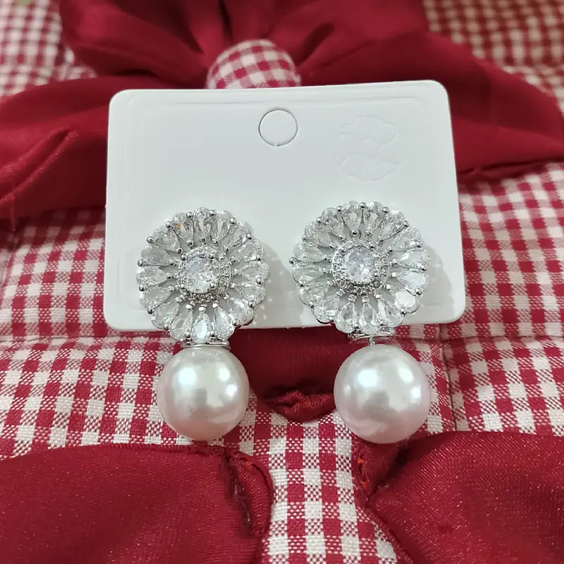 Each earring features a finely crafted floral motif, adorned with shimmering zircon stones that catch the light with every movement. At the heart of the flower rests a lustrous imitation pearl, radiating a soft, timeless glow that adds warmth and sophistication. The combination of crystals and pearls strikes a perfect balance of sparkle and subtlety, making them ideal for both understated elegance and standout style.