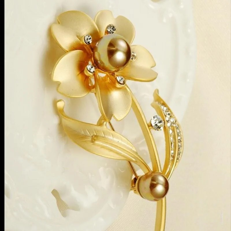 The radiant gold-tone finish gives it a rich, glamorous appeal, while the pearl at the center adds a touch of classic femininity. Glittering rhinestones highlight the petals and leaves, making this brooch sparkle beautifully under any light.