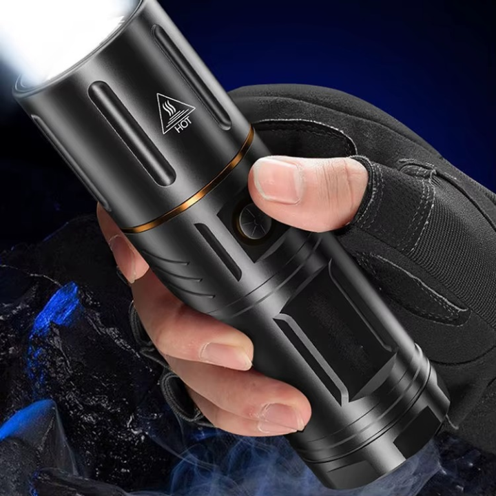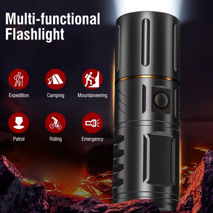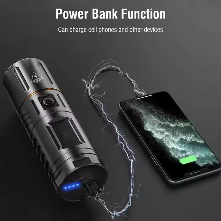 Stay safe and prepared with this Multi-functional Rechargeable Flashlight featuring a zoomable light beam and built-in power bank. Ideal for camping, riding, patrol, and emergency use.