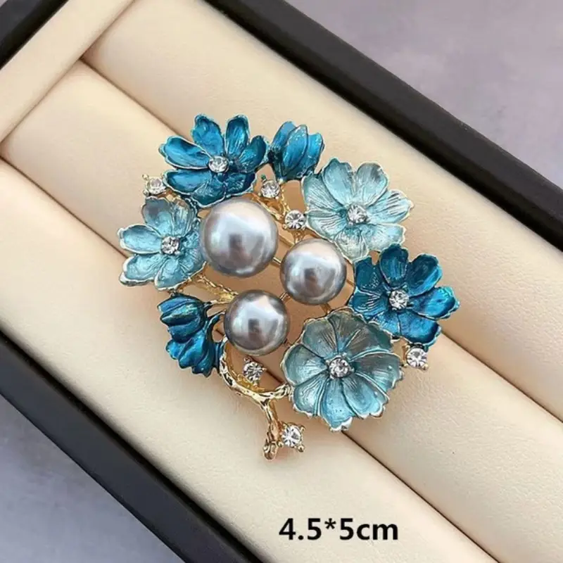 Each petal is delicately crafted with enamel detailing in gradient ocean tones, surrounding three lustrous pearls that symbolize purity and grace. Tiny crystal accents add just the right amount of sparkle, bringing the piece to life under any light. Whether pinned on a blazer, dress, scarf, or handbag, it makes a statement of elegance and individuality that never goes unnoticed.